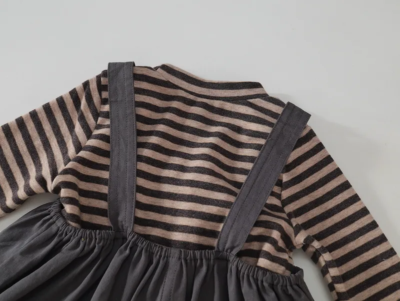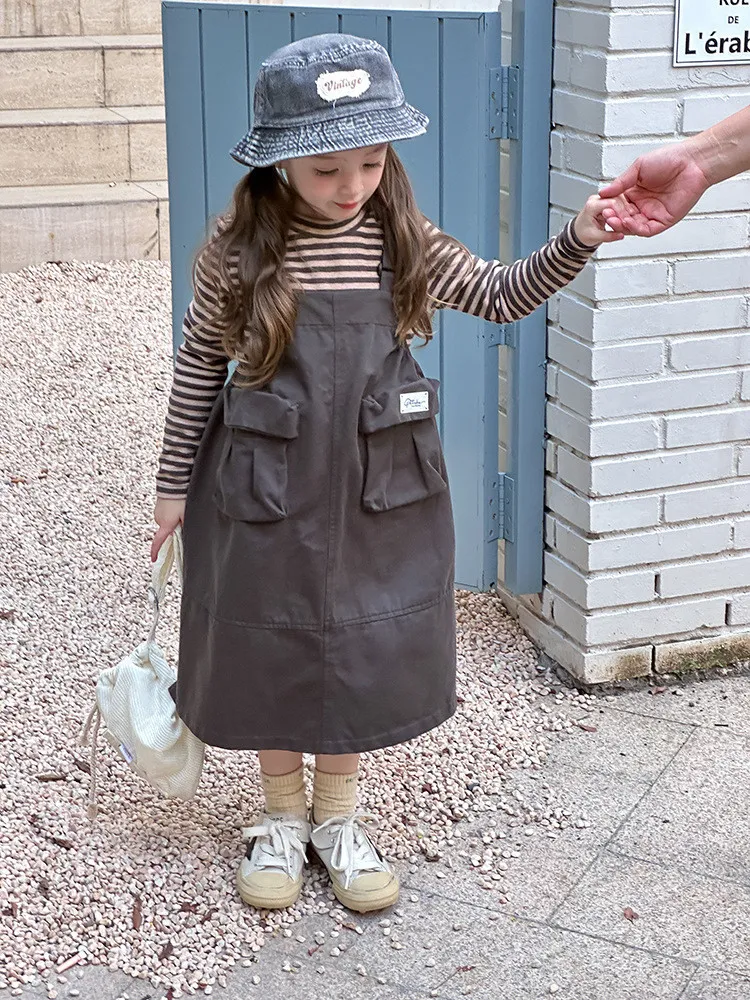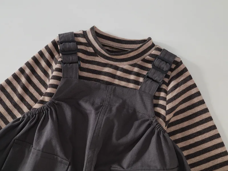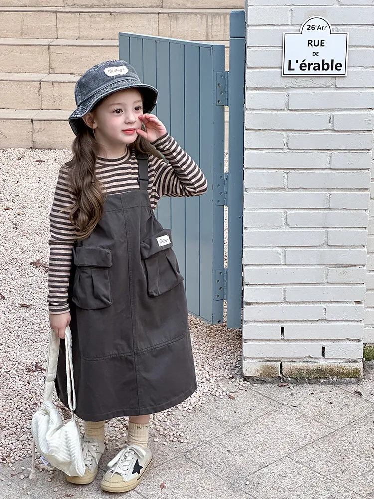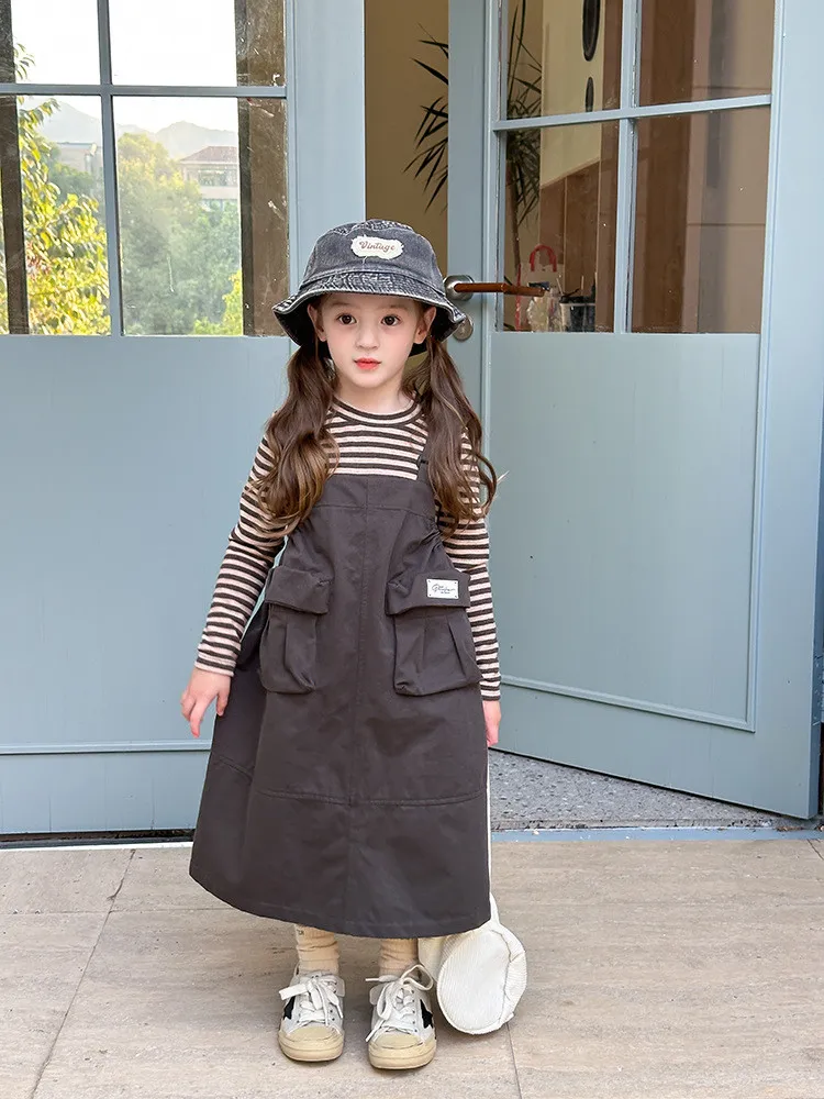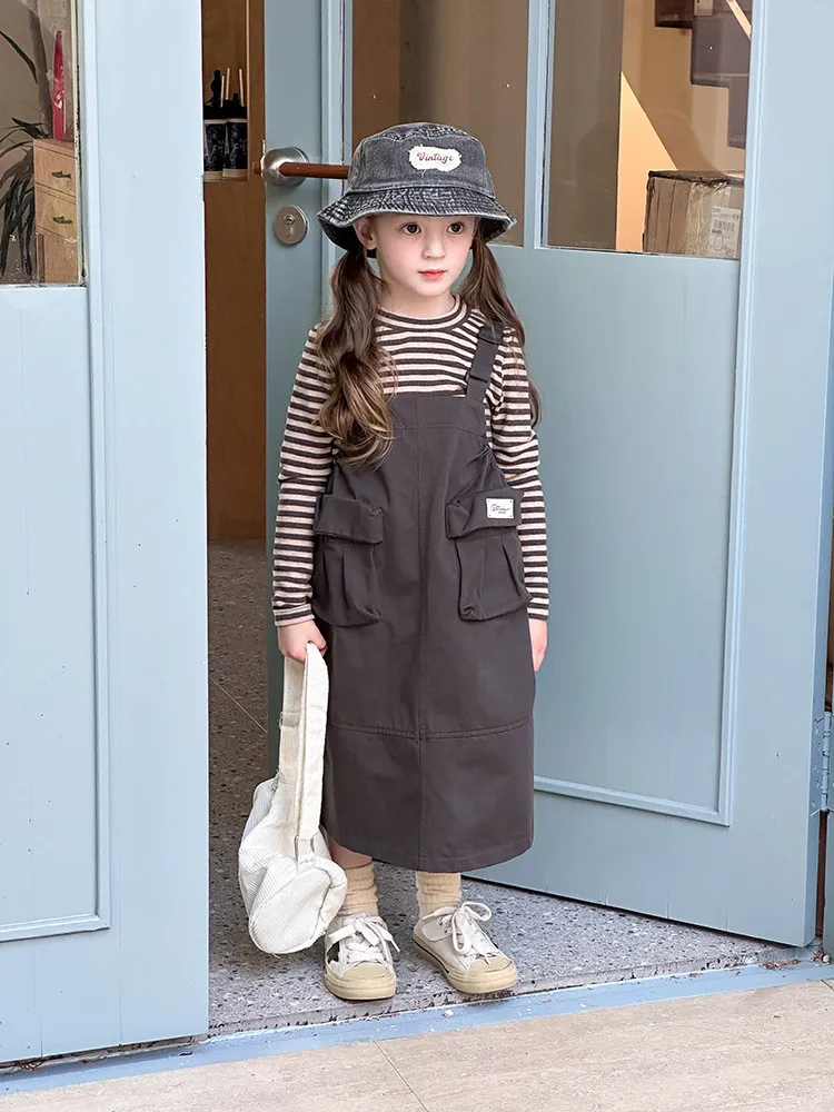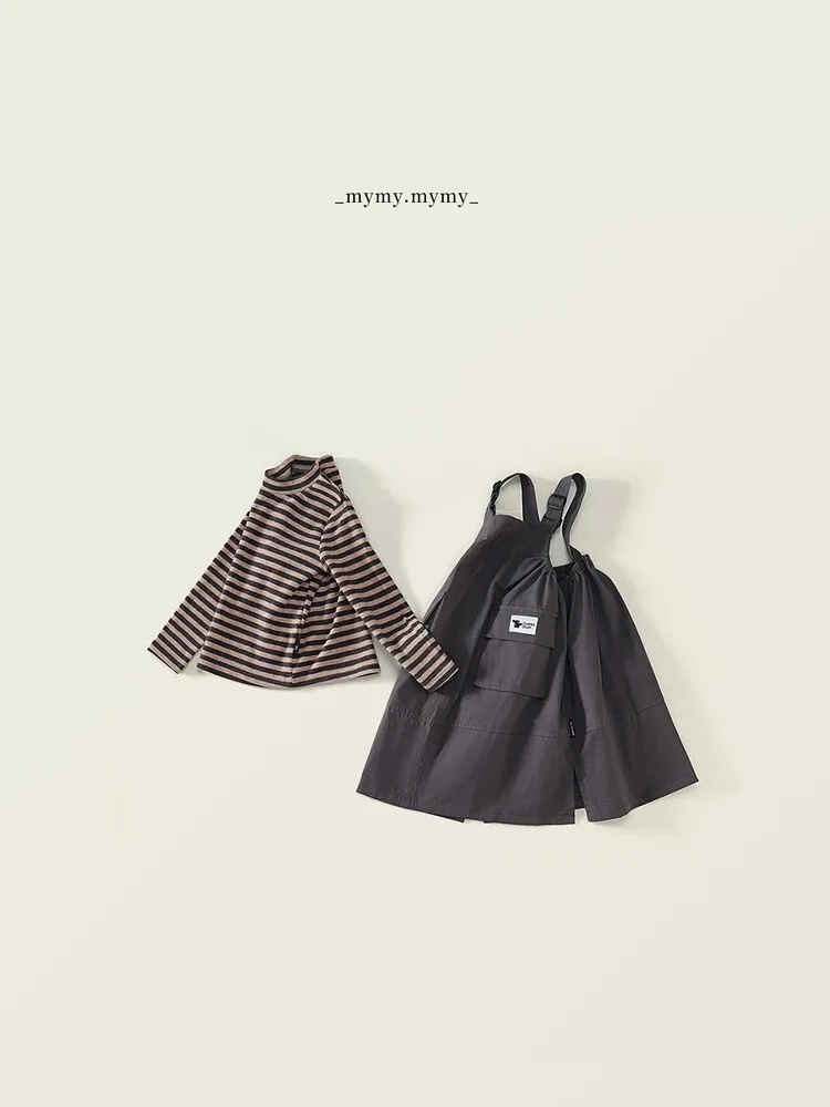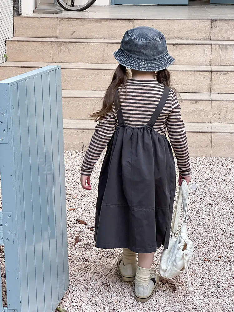 棉質條紋上衣+大口袋吊帶裙 (套裝)