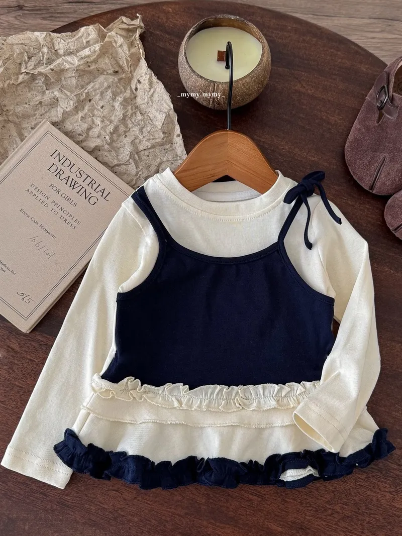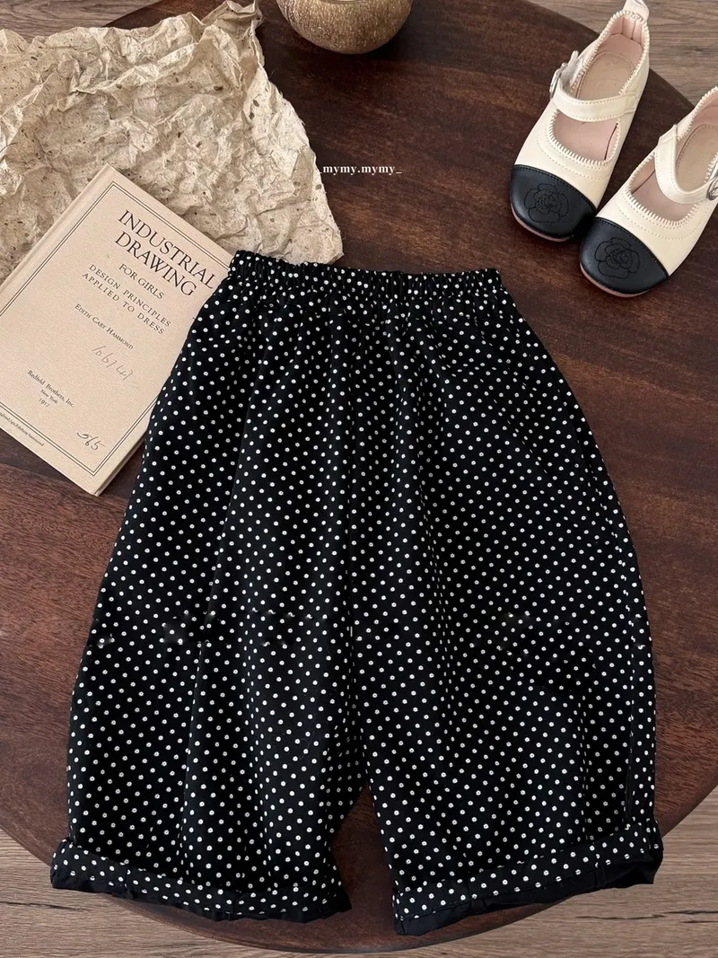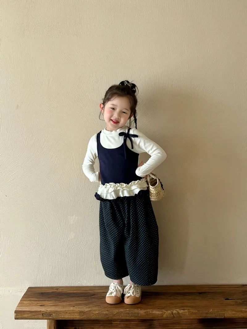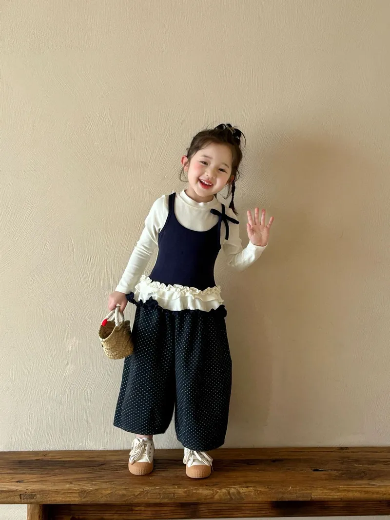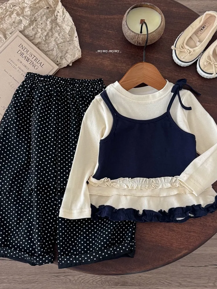 綁帶蝴蝶花邊上衣+波點寬褲 (套裝)