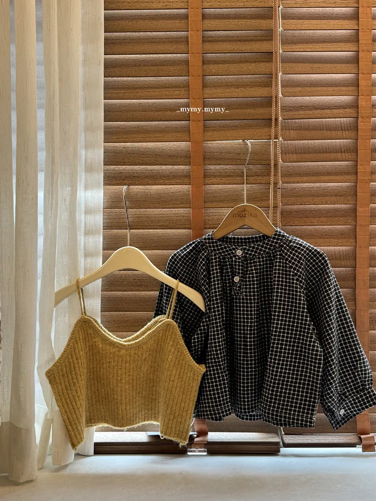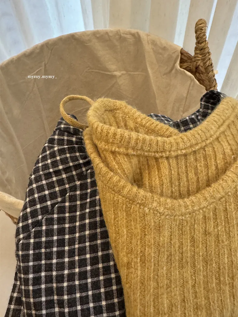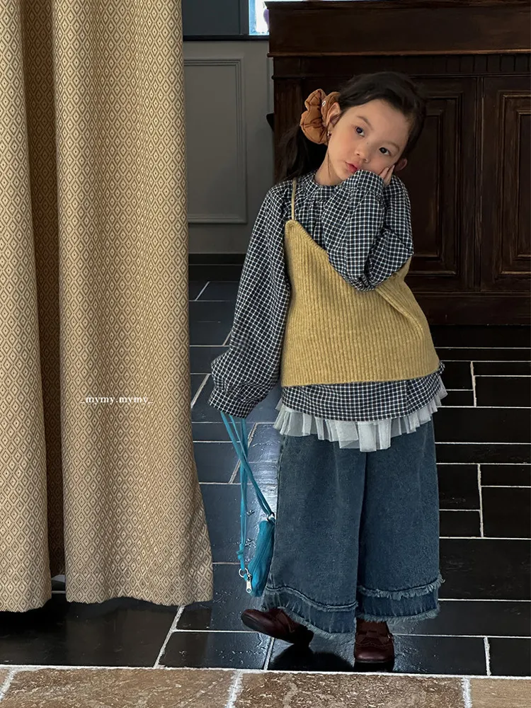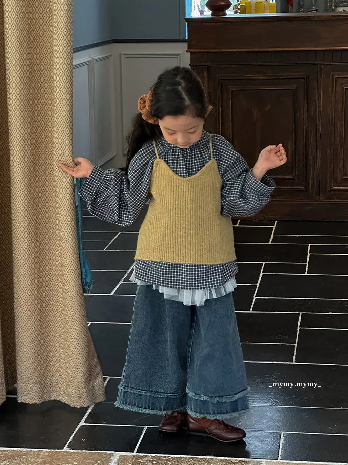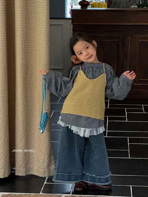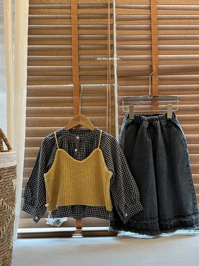 暖栗針織背心+格紋襯衫+毛邊牛仔寬褲三件組 (套裝)
