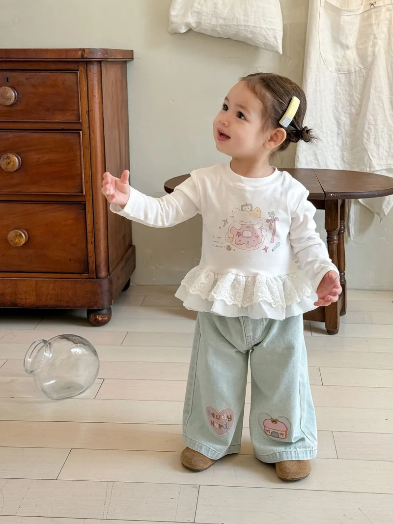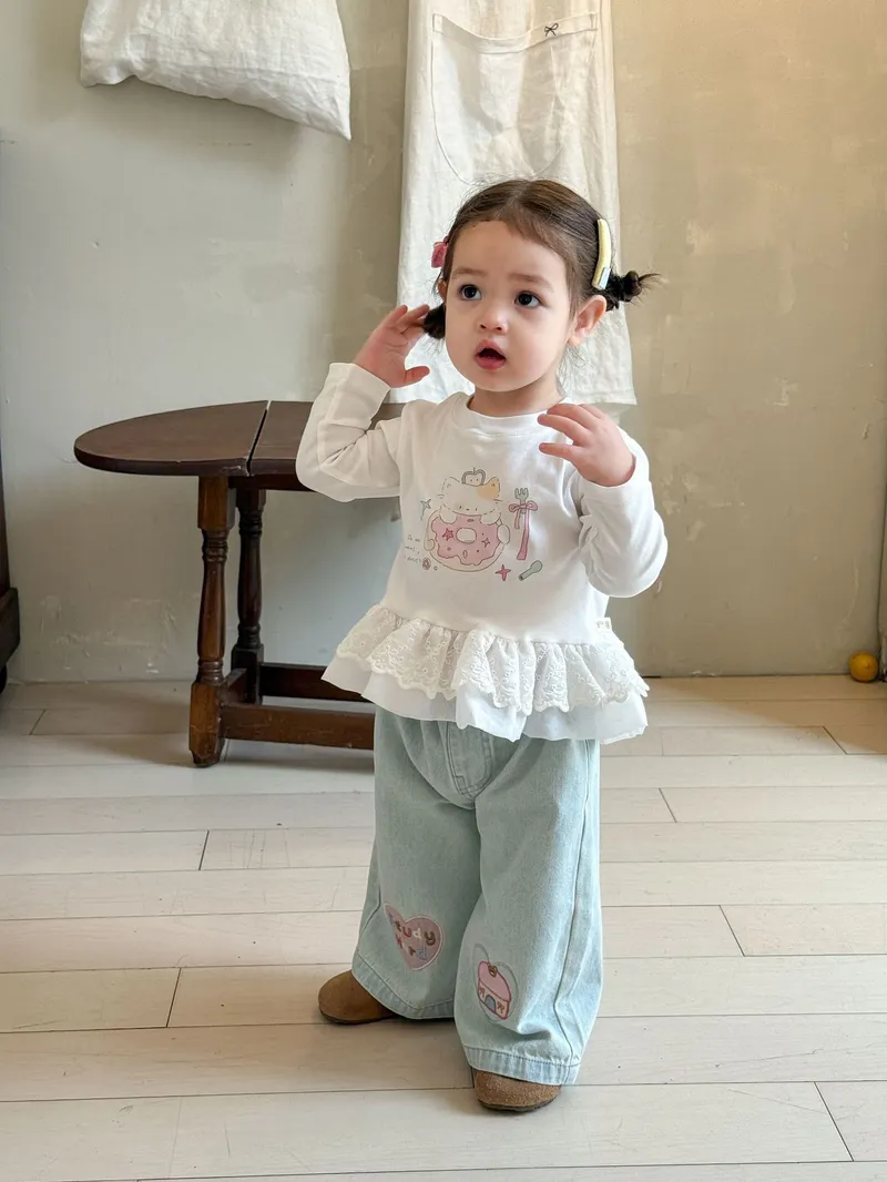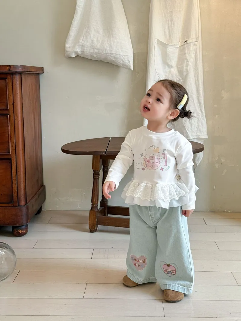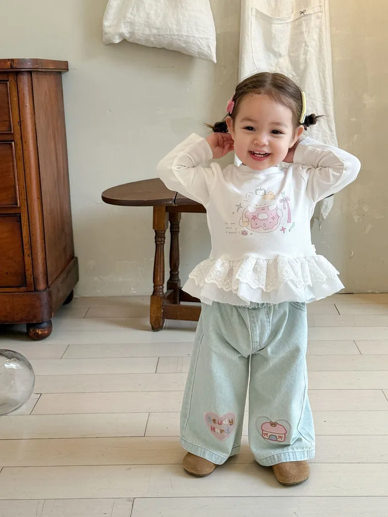 甜感蕾紗花邊上衣+柔軟刺繡插圖寬鬆牛仔褲(套裝)