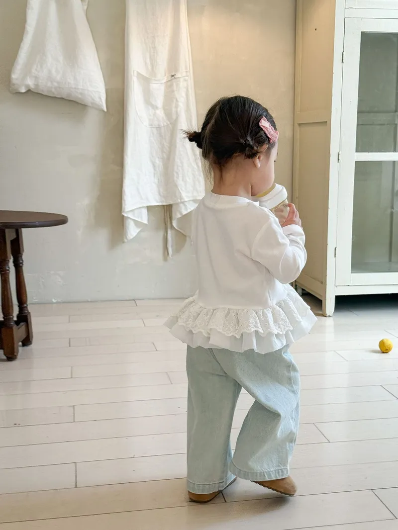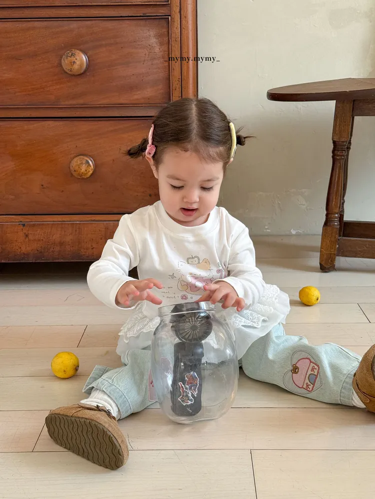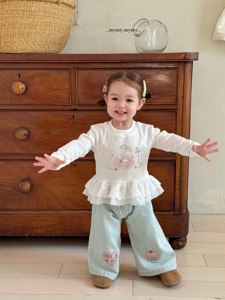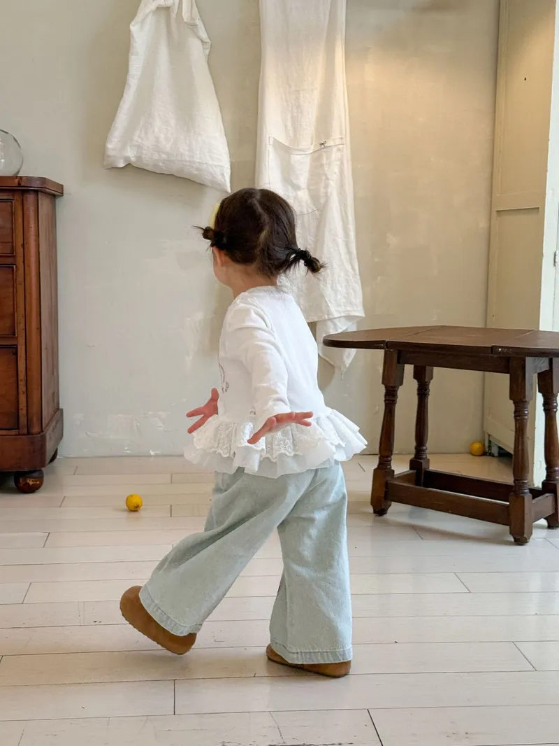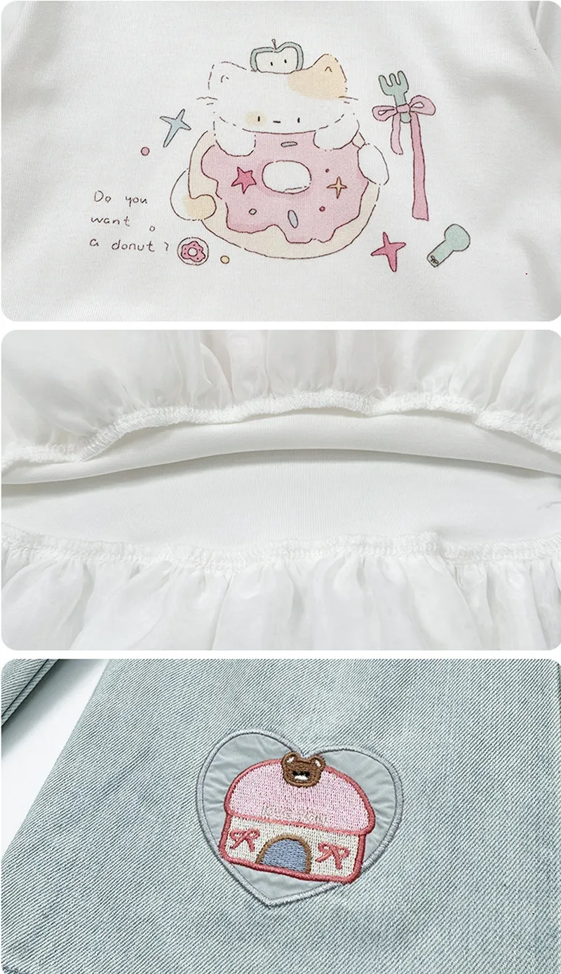 甜感蕾紗花邊上衣+柔軟刺繡插圖寬鬆牛仔褲(套裝)