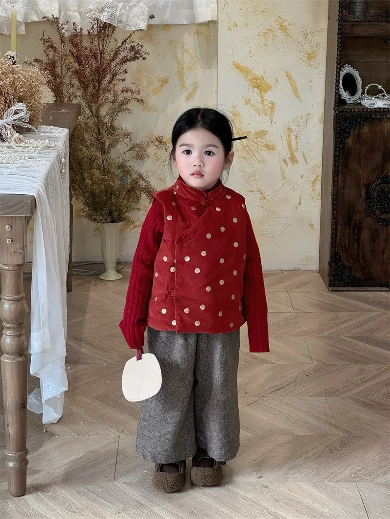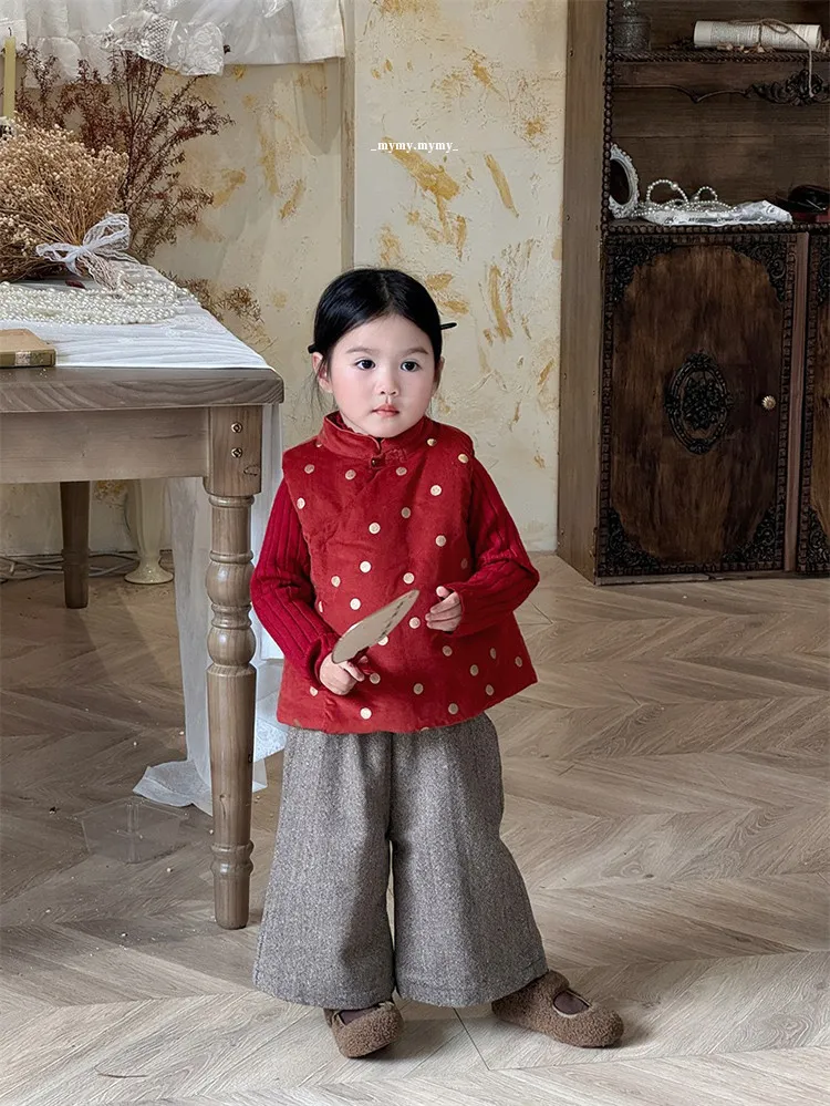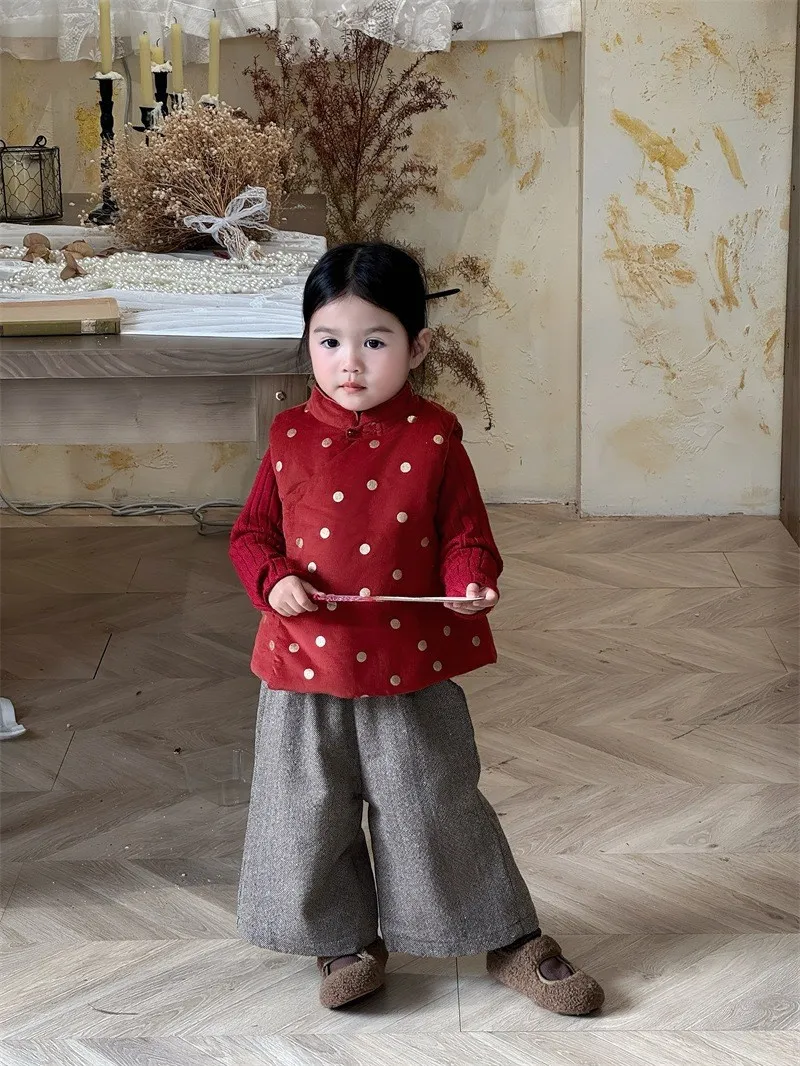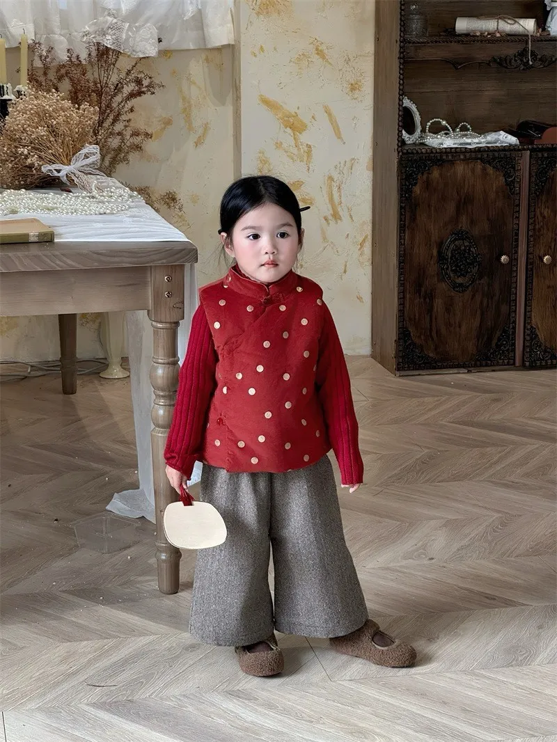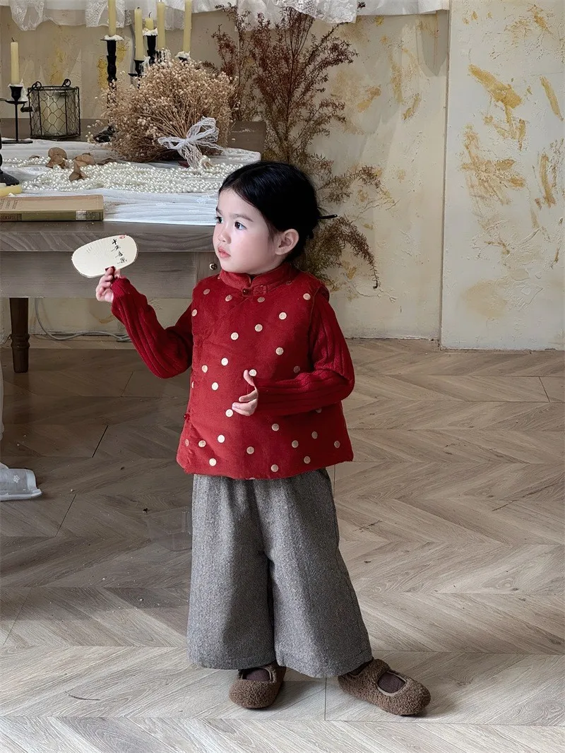 燙金波點中式背心+加絨毛呢九分寬褲套裝組