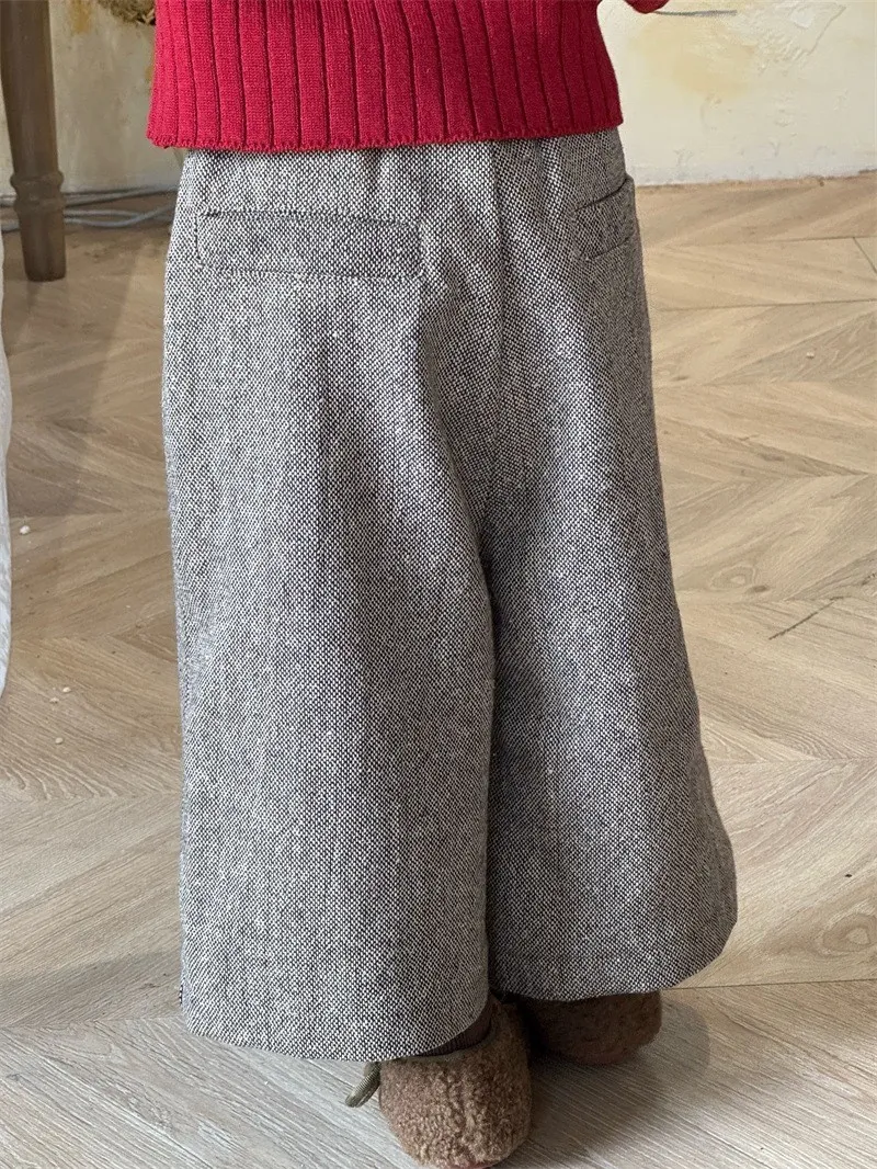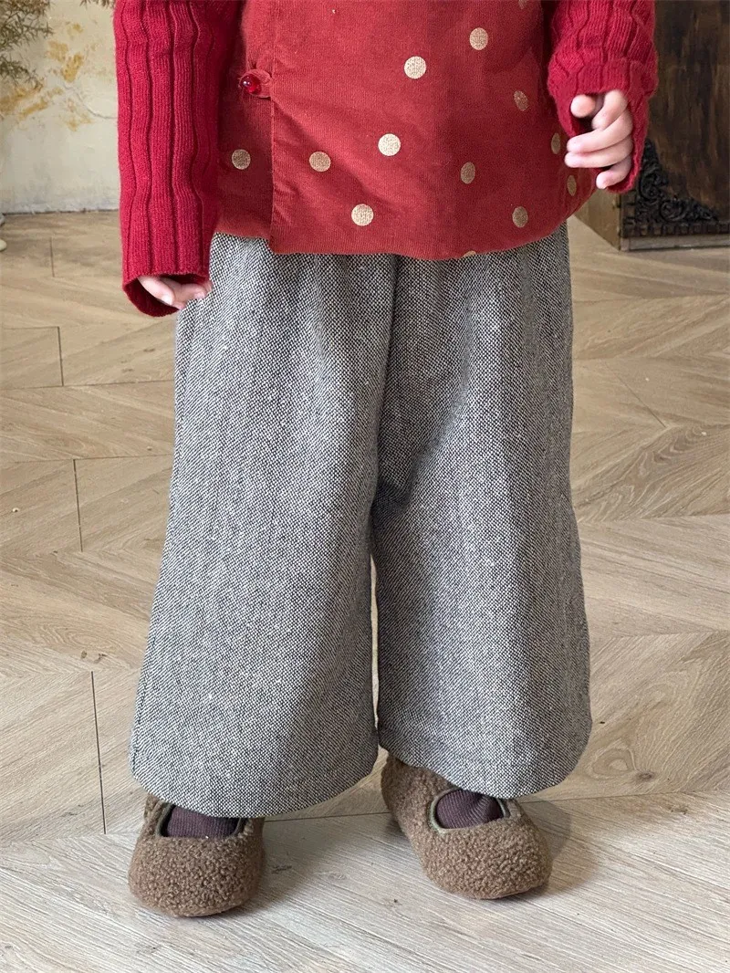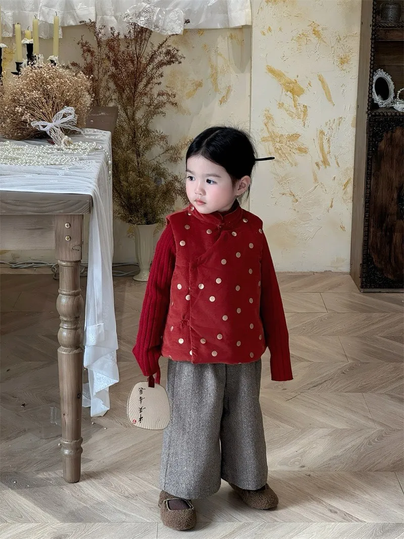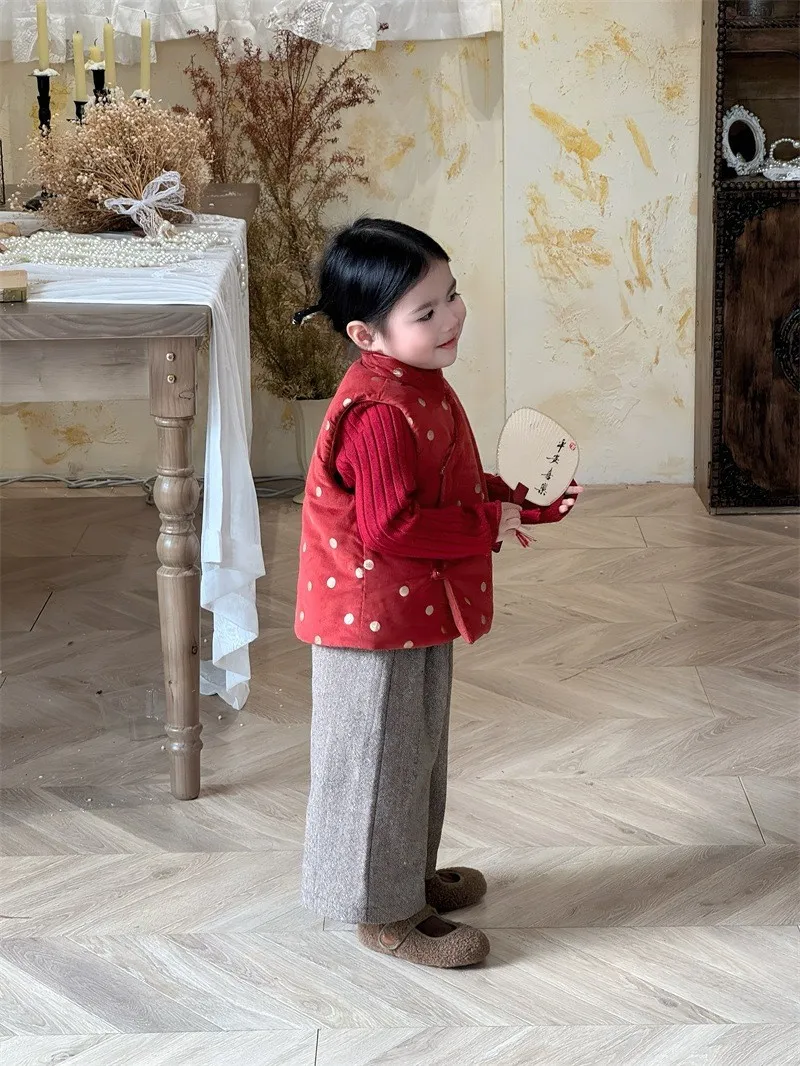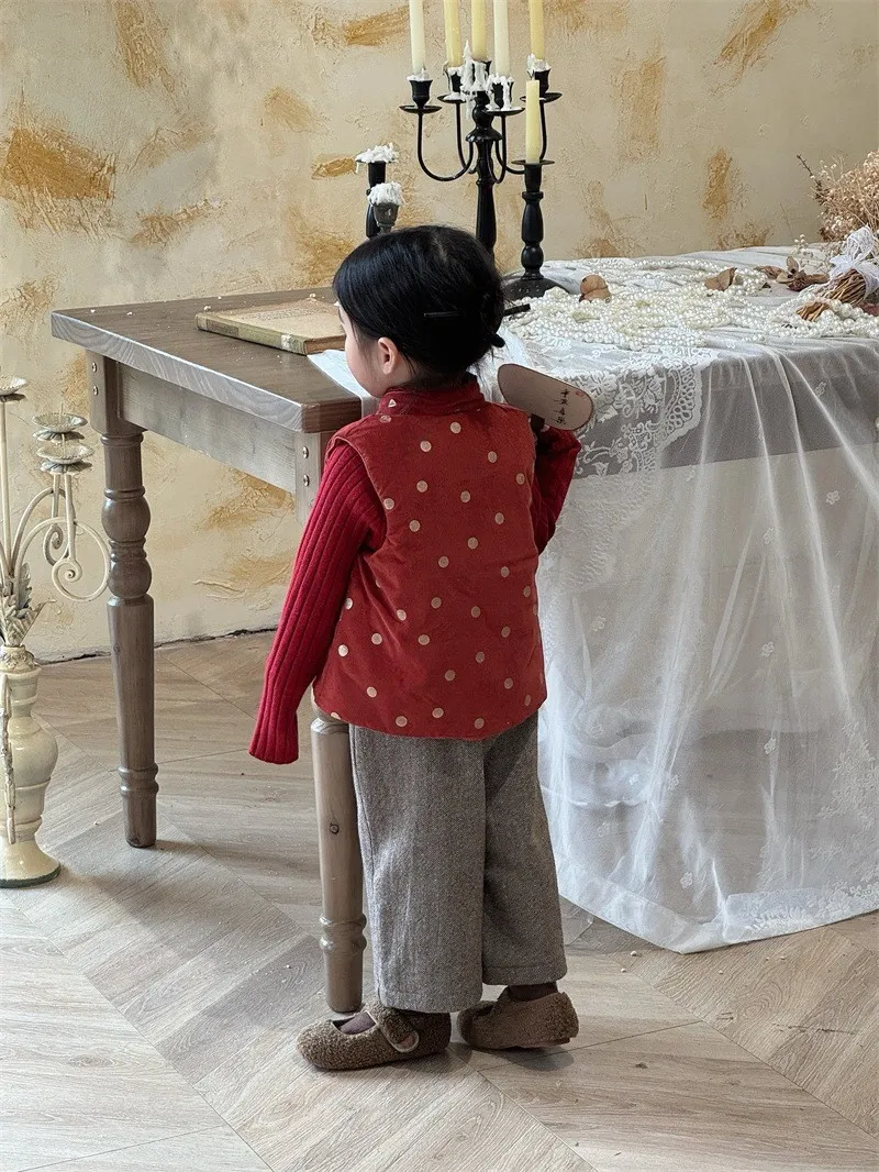 燙金波點中式背心+加絨毛呢九分寬褲套裝組