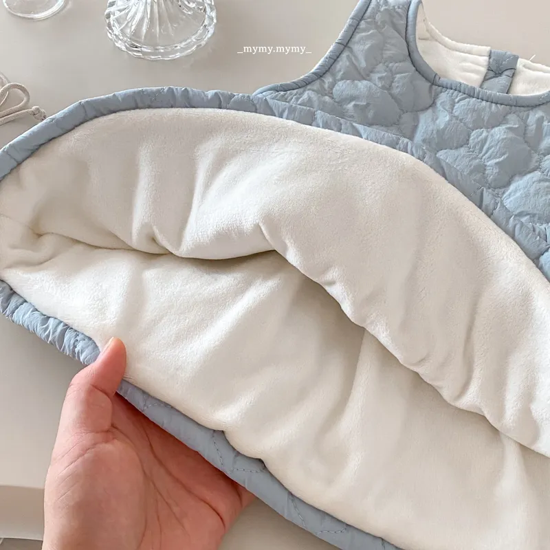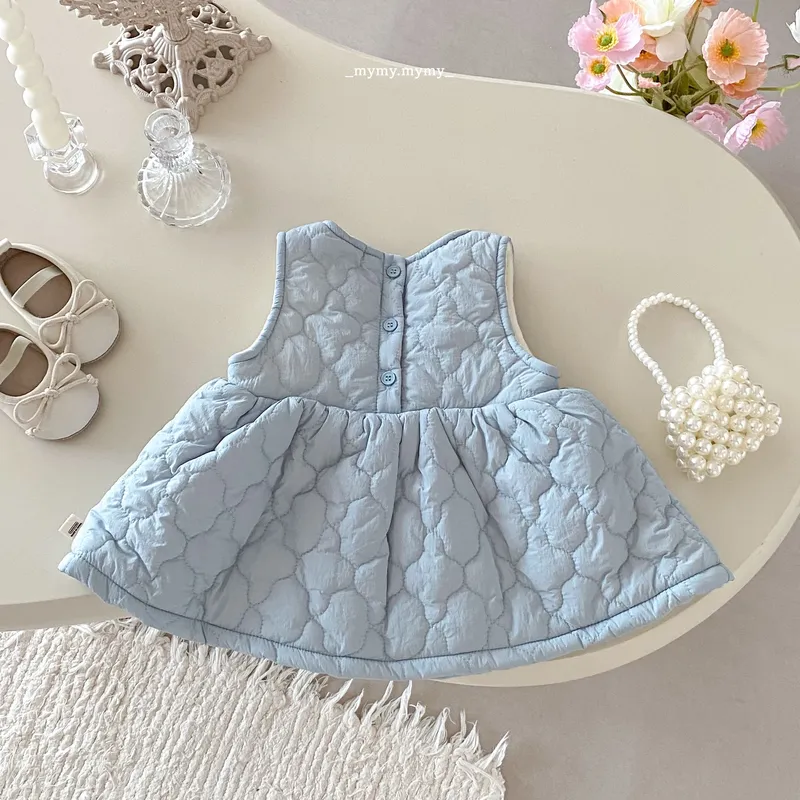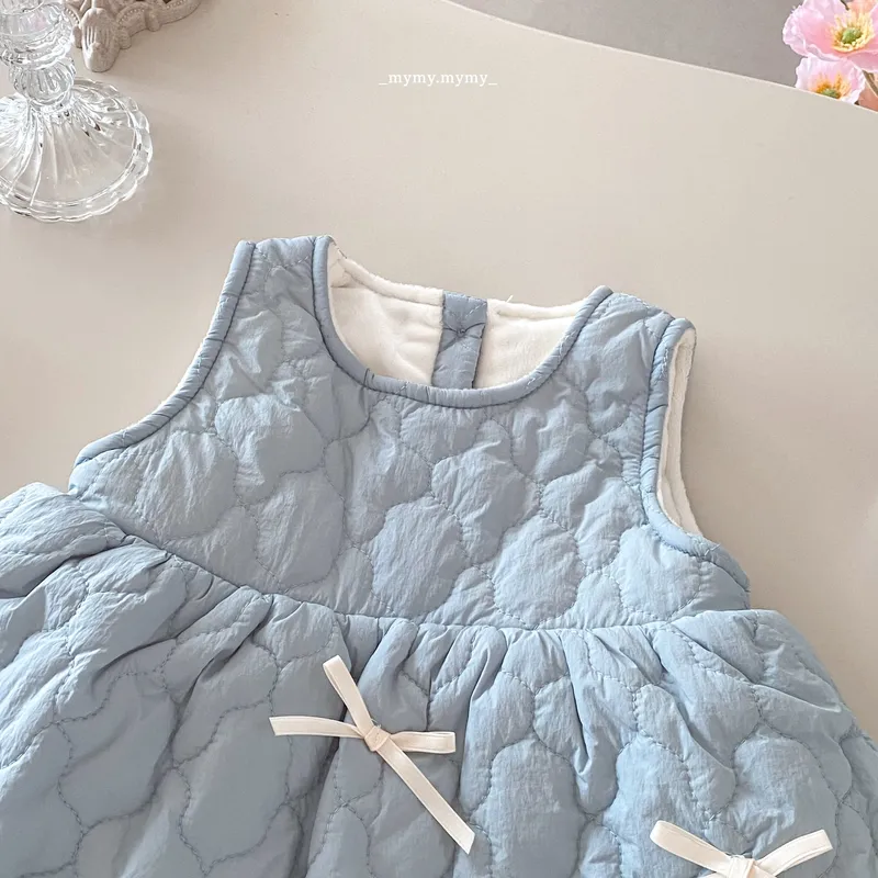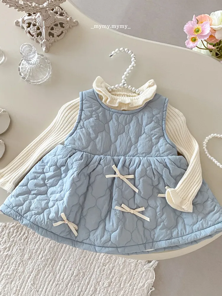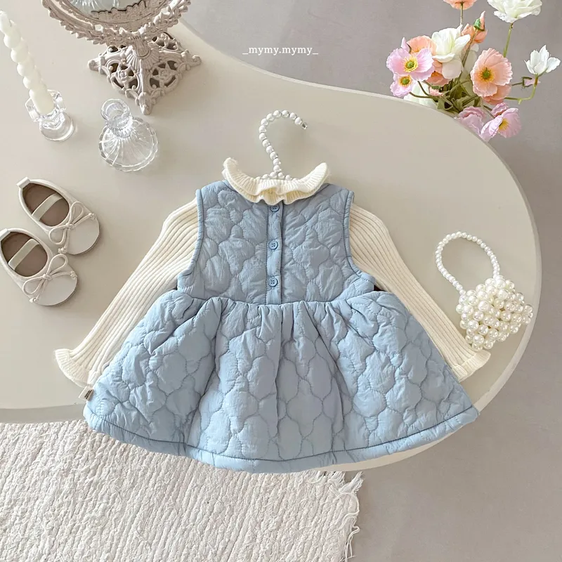 大花邊針織坑條上衣+淡藍色緞帶夾棉背心裙套裝組