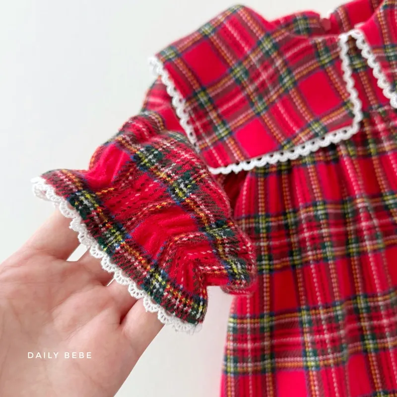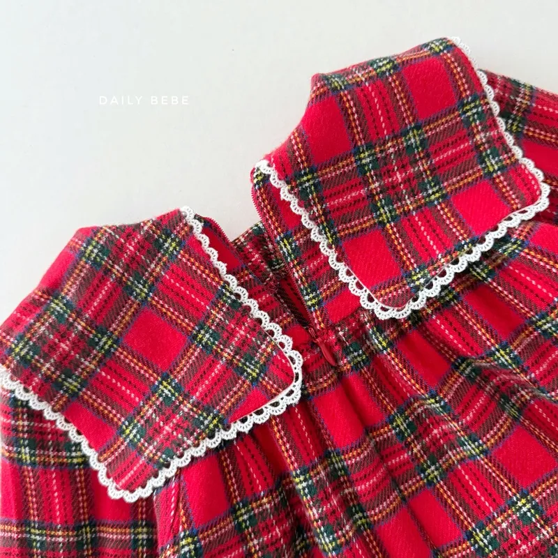 DAILY BEBE|紅通通格紋花邊領洋裝