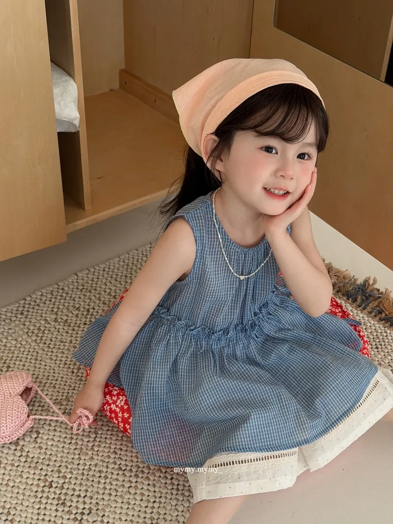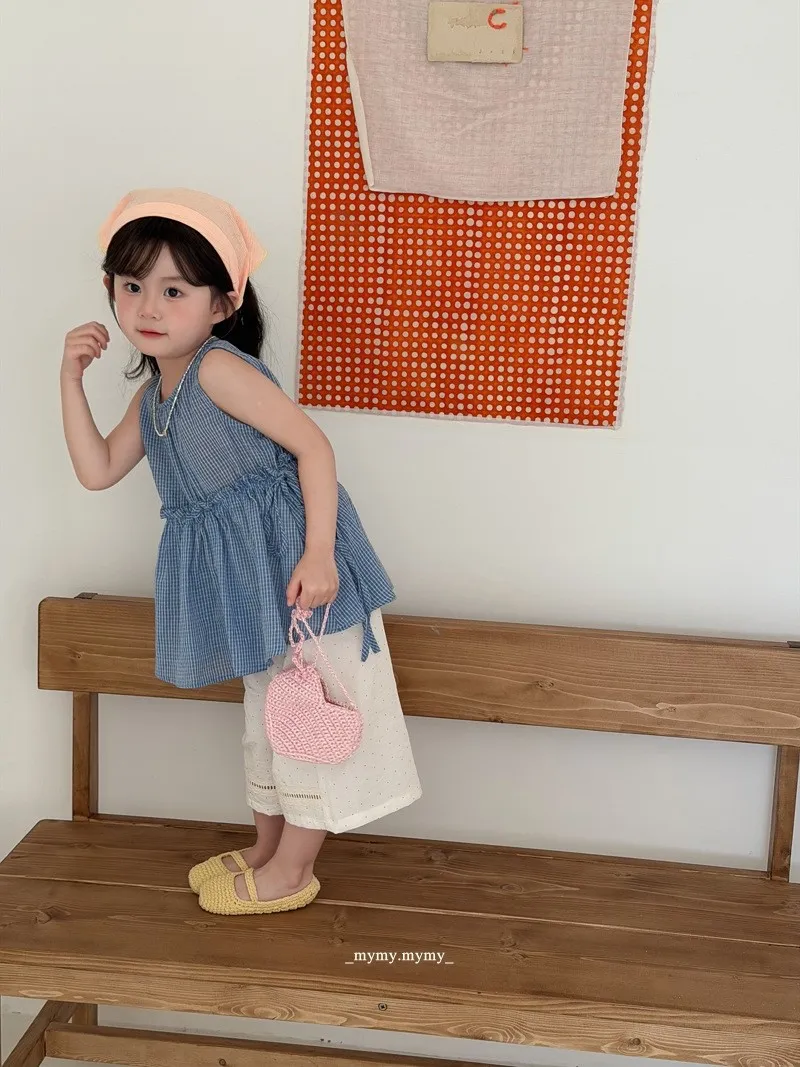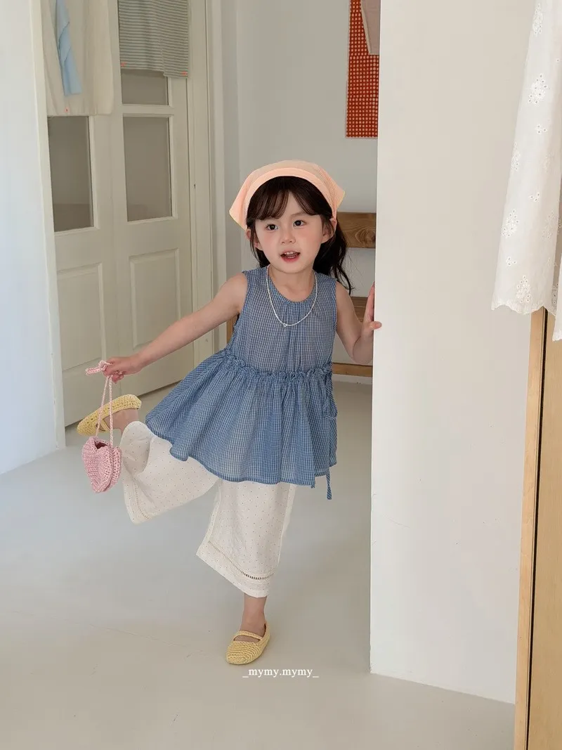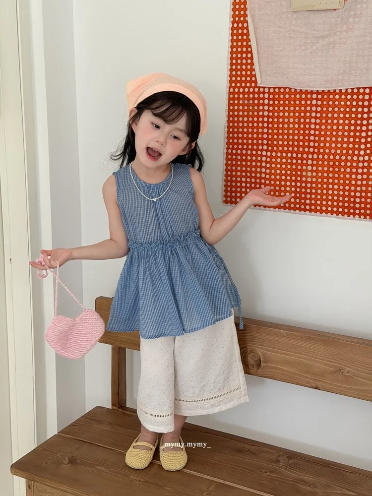 經典藍格紋荷葉腰背心+九分小波點寬褲套裝組
