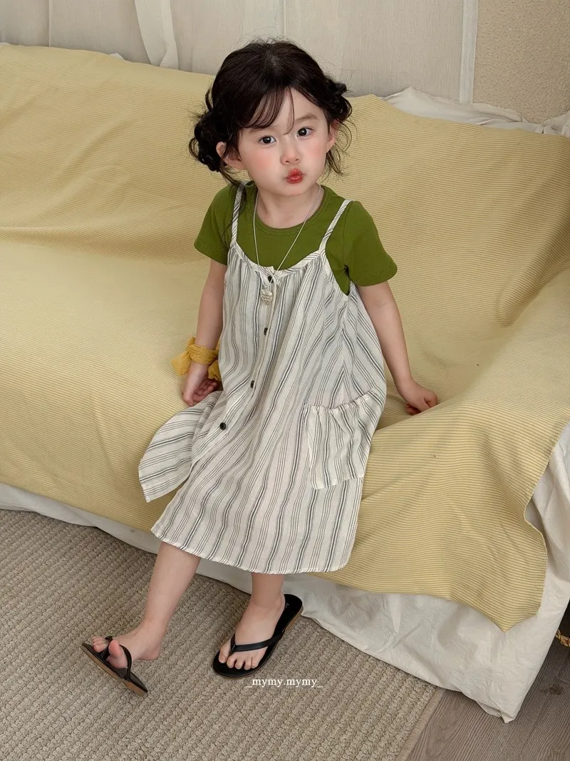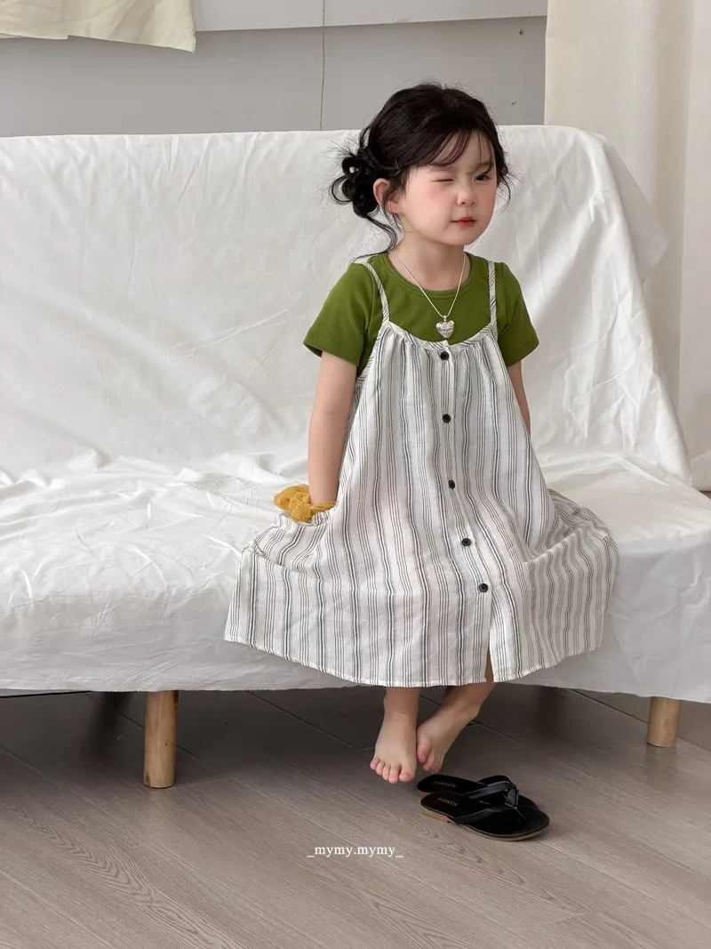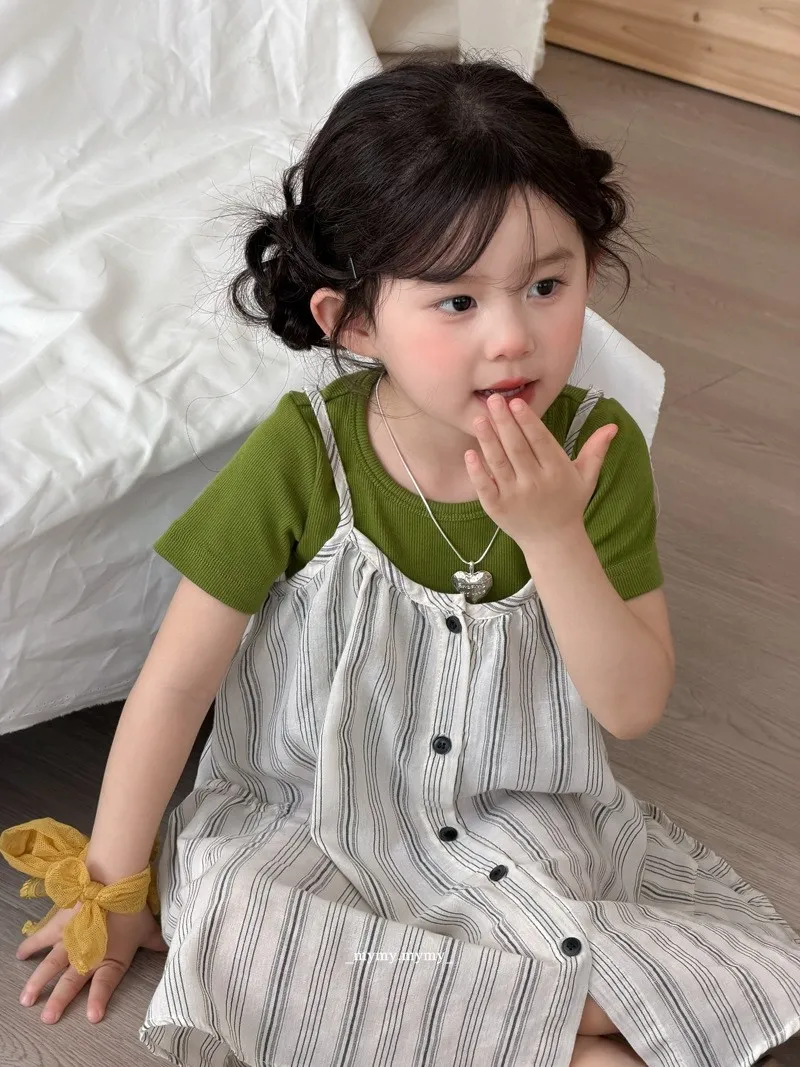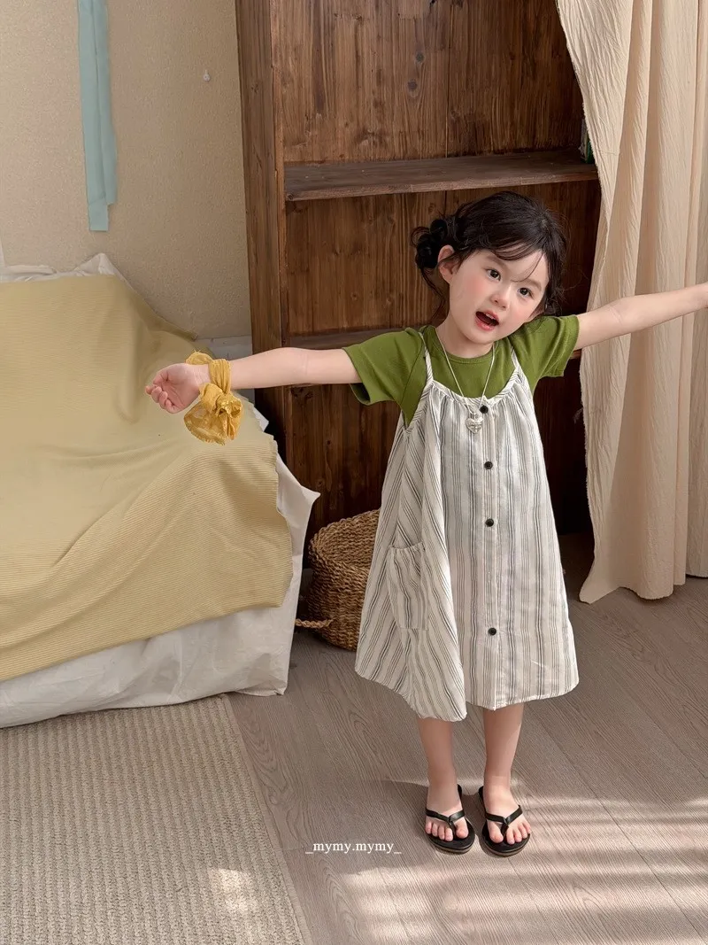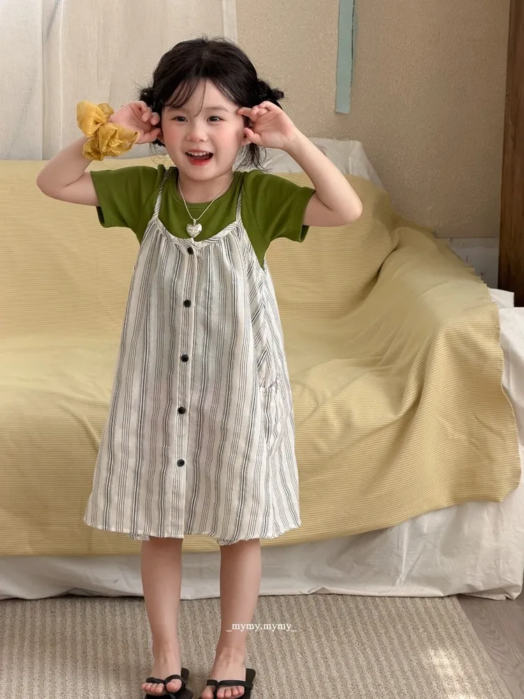 撞色綠意條紋排釦連身裙兩件套裝